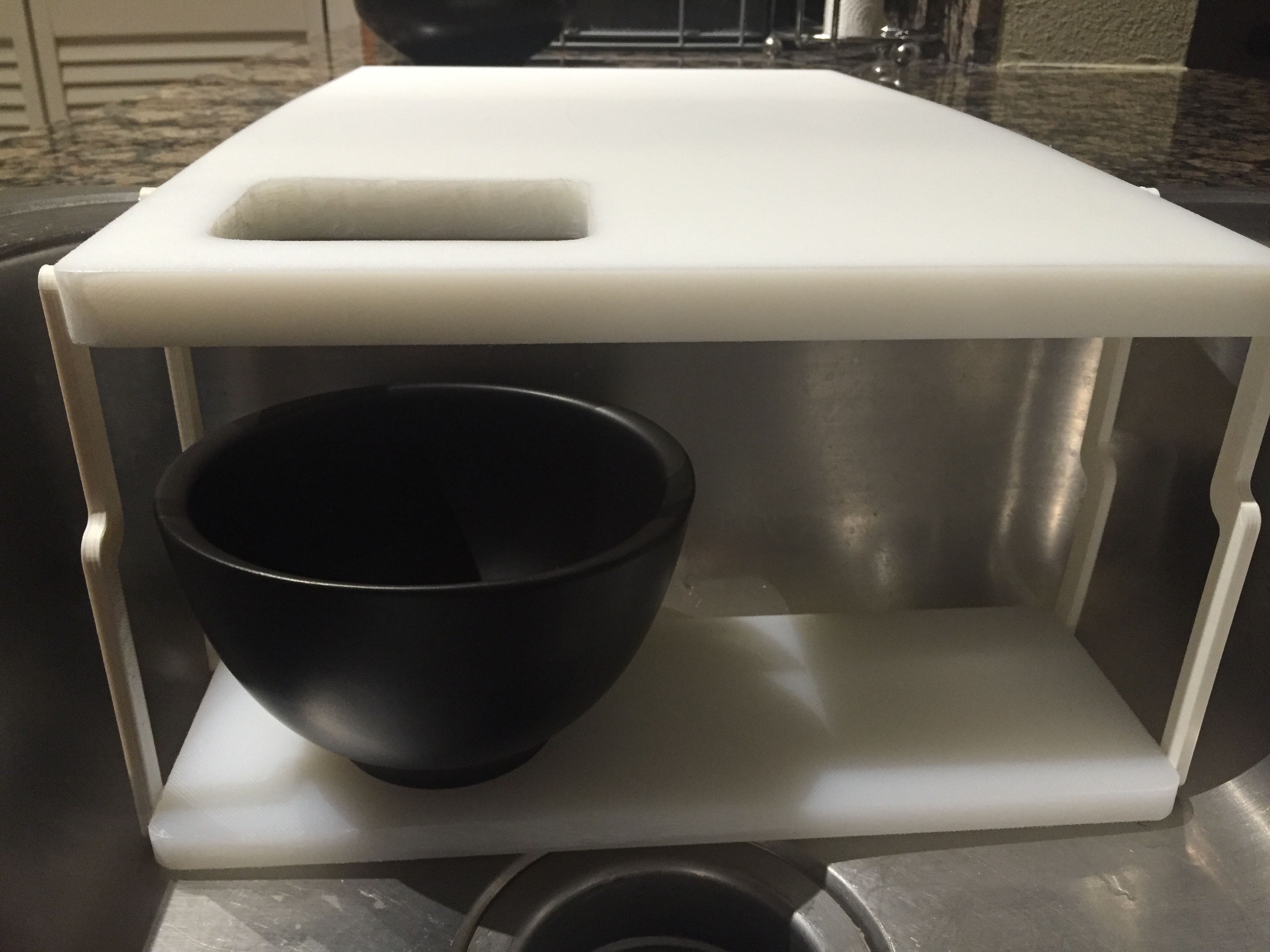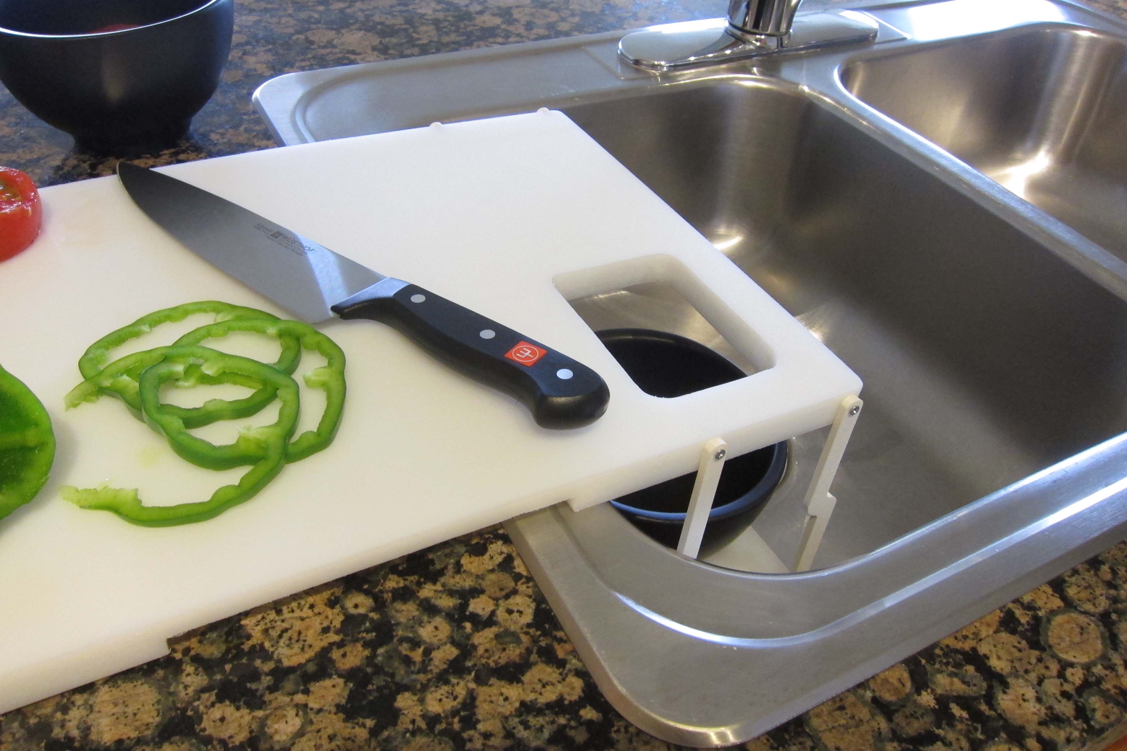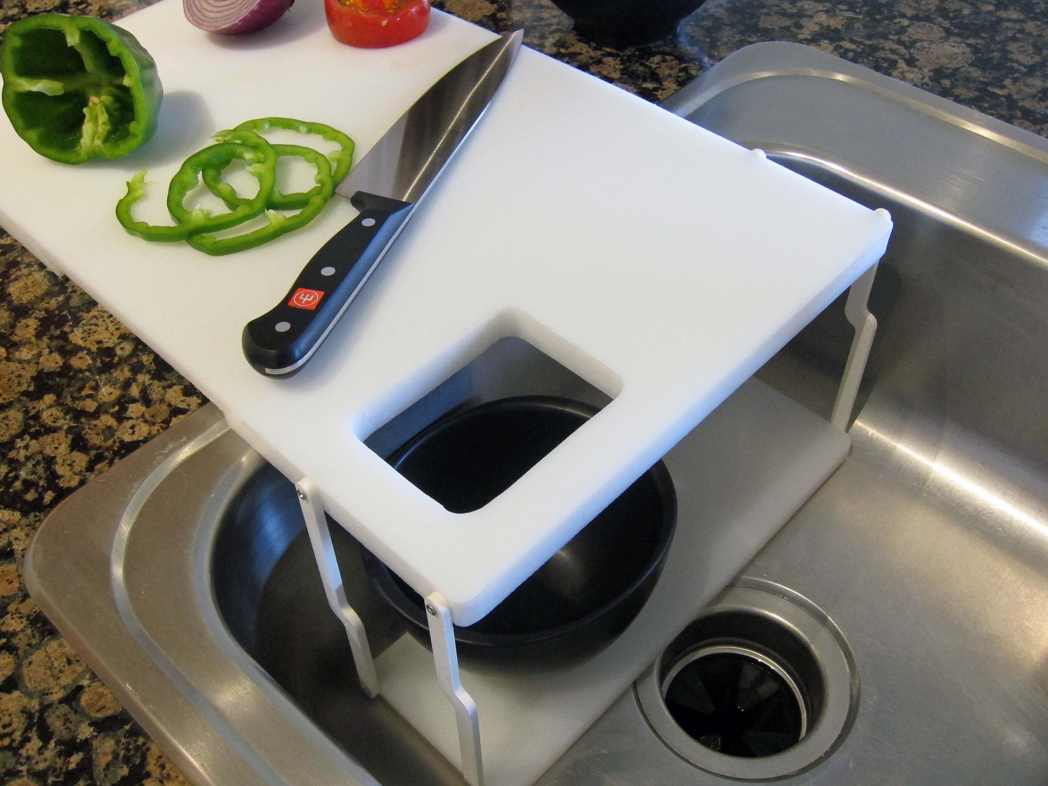 The Chop Hopper’s™ patented* unique two-level over-sink design allows for simpler, touch-free food preparation. Position a container on the lower shelf under the hopper to catch chopped food, slide waste material directly into the sink disposal.