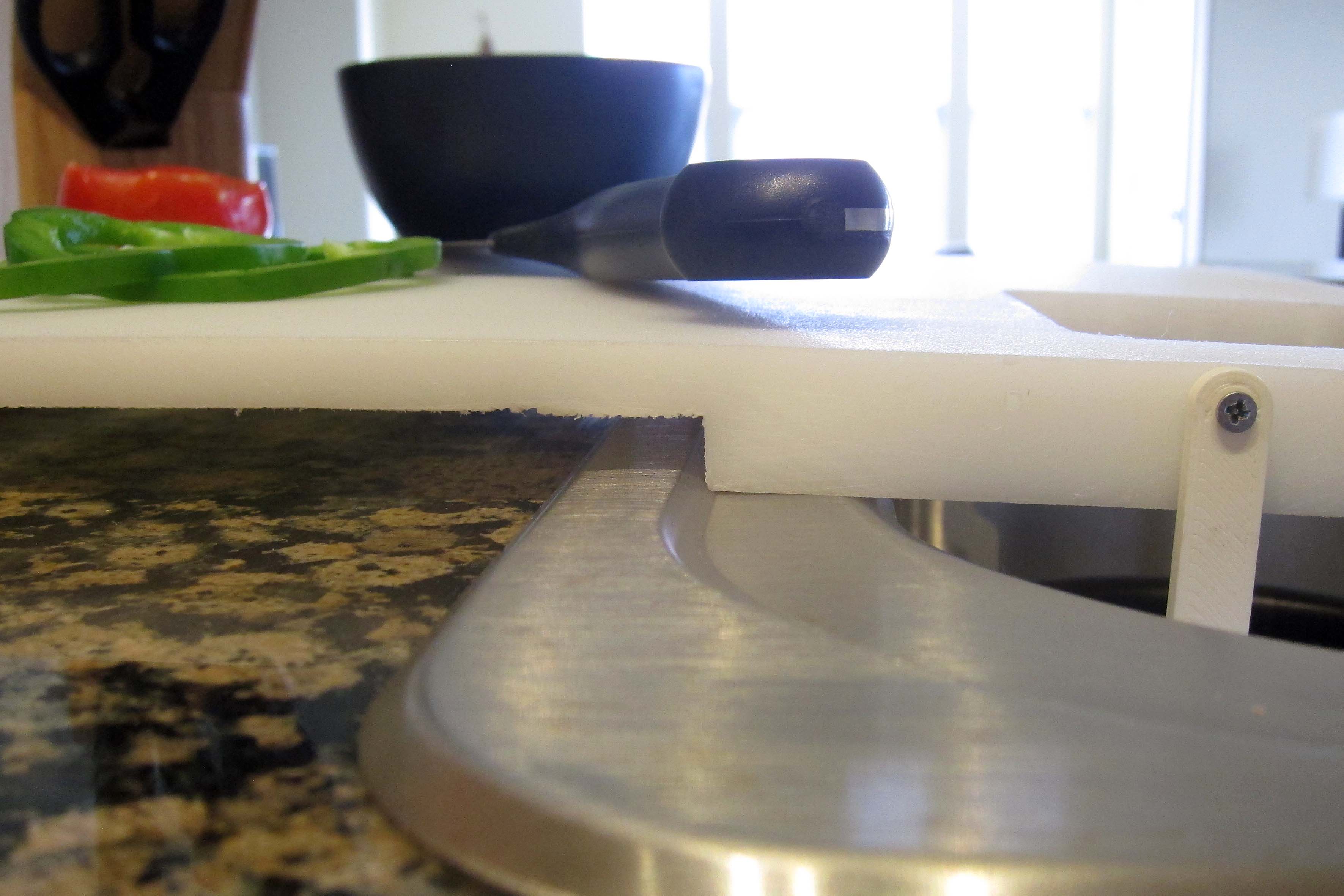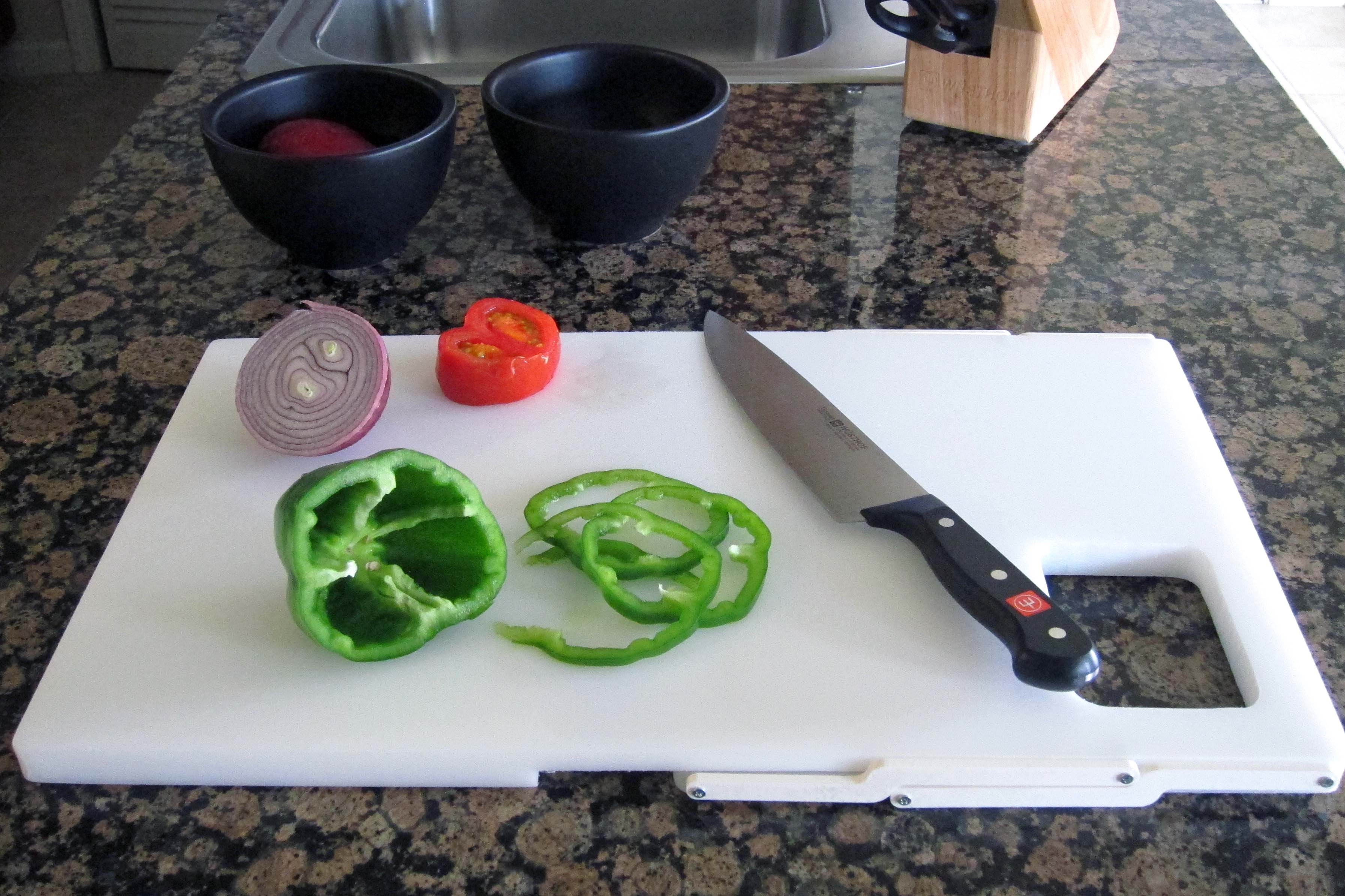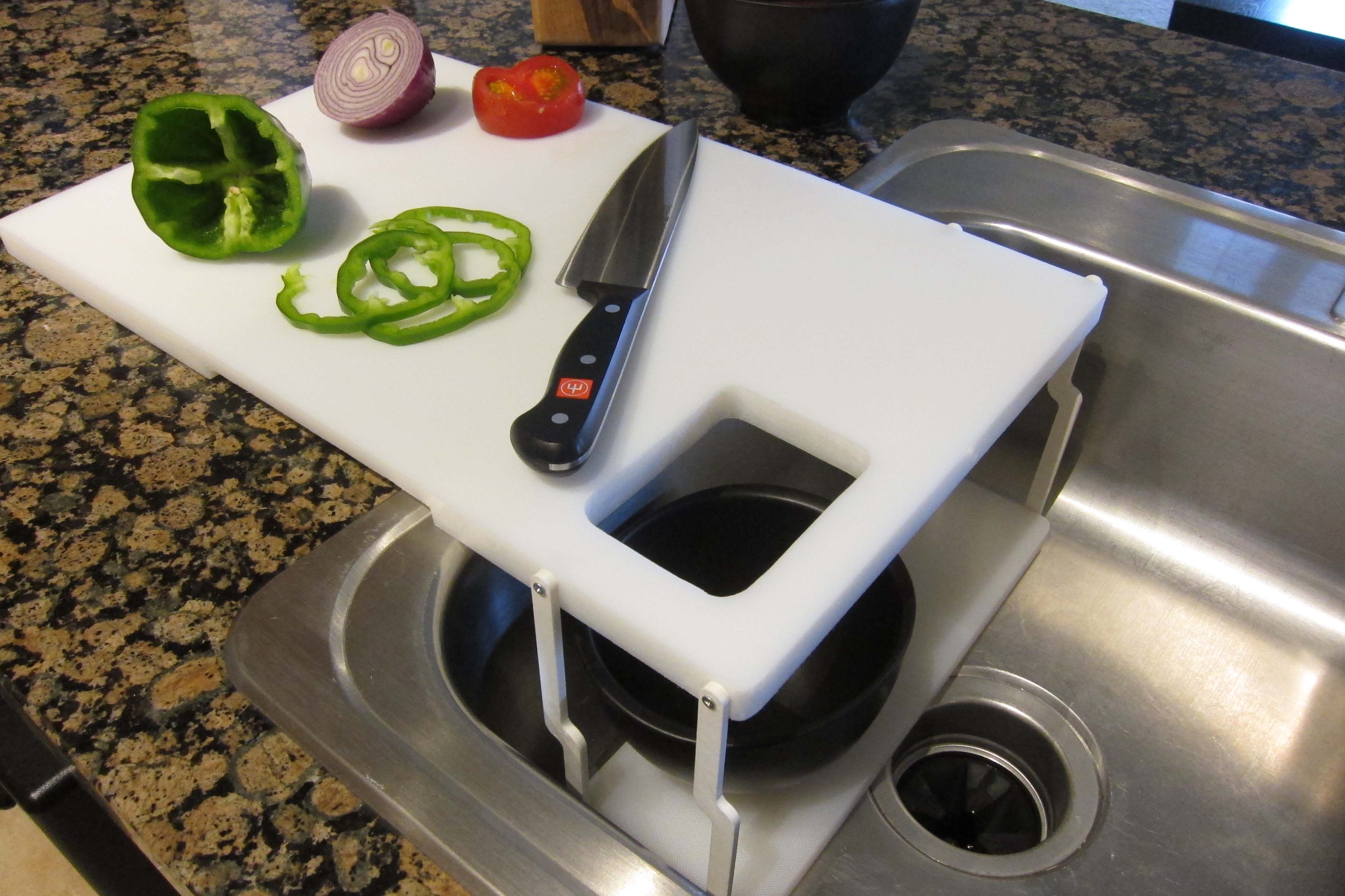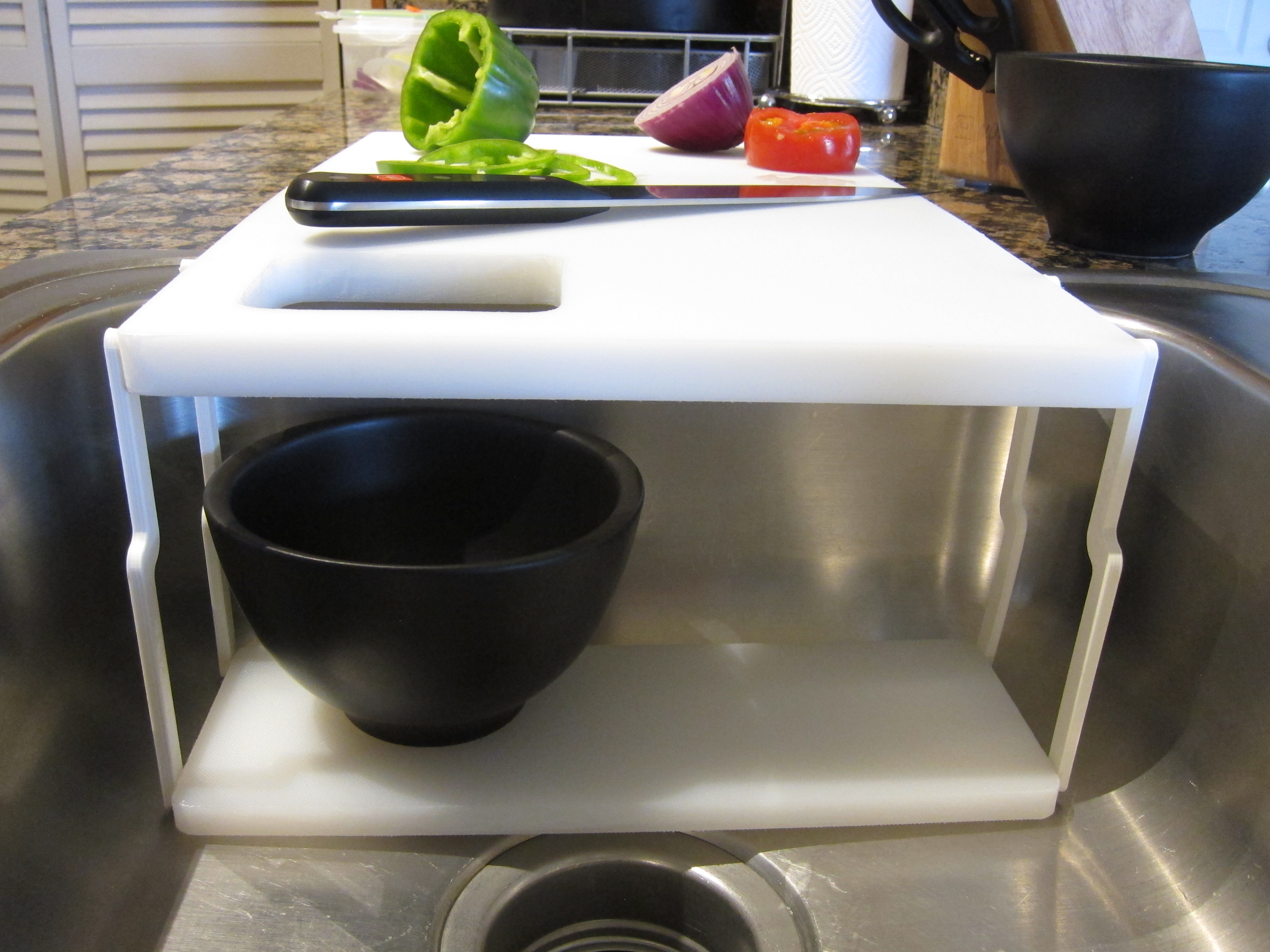 The Chop Hopper’s™ patented* unique two-level over-sink design allows for simpler, touch-free food preparation. Position a container on the lower shelf under the hopper to catch chopped food, slide waste material directly into the sink disposal.